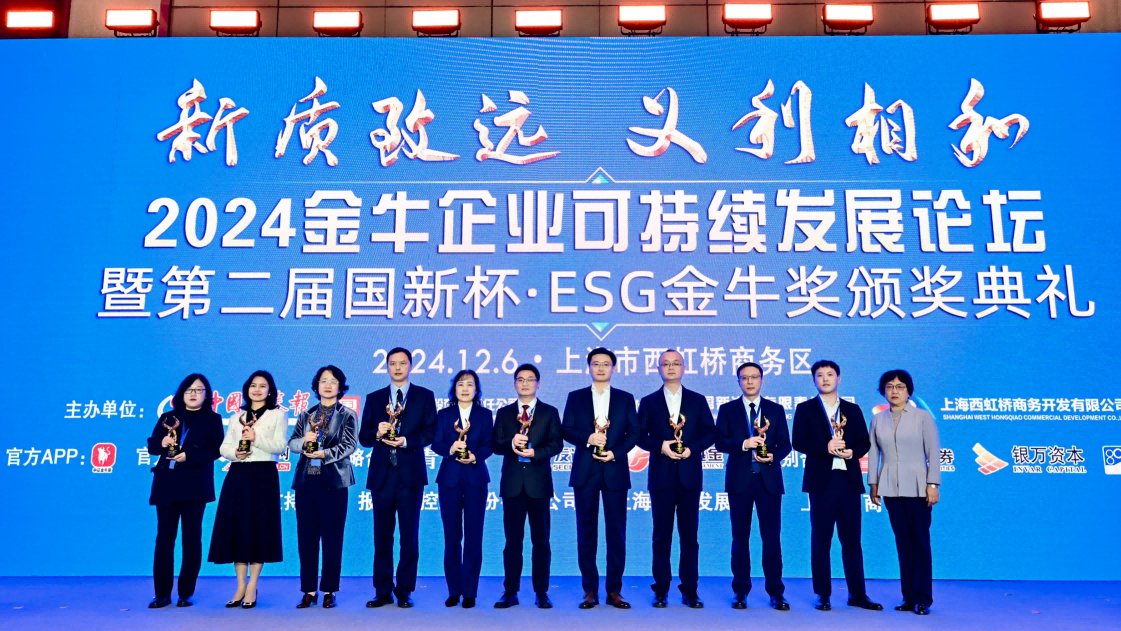 12月6日,由中國中證報(bào)和中國國新控股有限責(zé)任公司聯(lián)合主辦的“2024金牛企業(yè)可持續(xù)發(fā)展論壇暨第二屆國新杯ESG金牛獎(jiǎng)?lì)C獎(jiǎng)典禮”在上海青浦區(qū)舉辦。公司副總經(jīng)理、董事會(huì)秘書、總法律顧問郝家華受邀參加本次論壇。中節(jié)能環(huán)境2024年精心編制并首次公開披露的ESG報(bào)告,在本次論壇中喜獲國新杯“ESG金牛獎(jiǎng)新銳二十強(qiáng)”榮譽(yù)稱號(hào)。