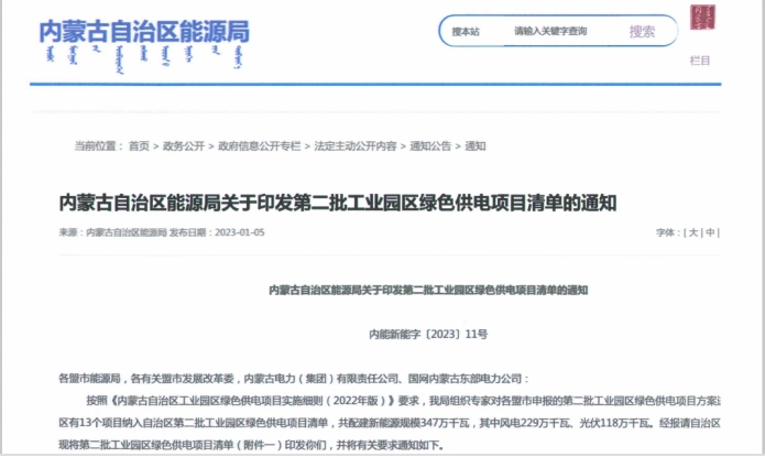 新年伊始,內(nèi)蒙古自治區(qū)能源局發(fā)布《關(guān)于印發(fā)第二批工業(yè)園區(qū)綠色供電項(xiàng)目清單的通知》,由風(fēng)電內(nèi)蒙公司與烏蘭察布市能源投資開發(fā)有限公司聯(lián)合申報(bào)的察右前旗京蒙合作產(chǎn)業(yè)園(天皮山)工業(yè)園區(qū)綠色供電項(xiàng)目,被納入內(nèi)蒙古自治區(qū)第二批工業(yè)園區(qū)綠色供電項(xiàng)目清單,項(xiàng)目建設(shè)容量為10萬千瓦。