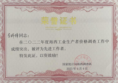 風(fēng)電青海公司李瑞博獲得海西州2022年度生產(chǎn)者價格調(diào)查“先進(jìn)工作者”榮譽(yù)稱號 |