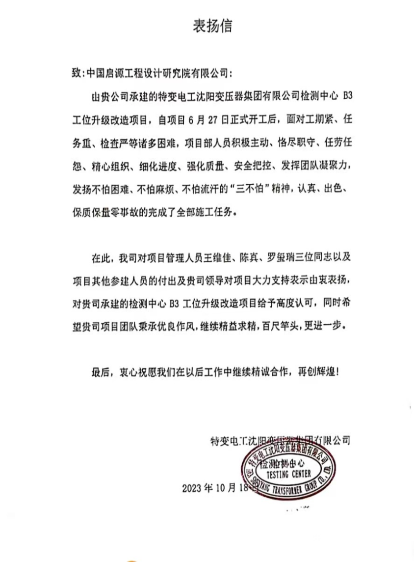 近日,中國(guó)啟源所屬啟源設(shè)計(jì)負(fù)責(zé)的特變電工沈陽(yáng)變壓器集團(tuán)有限公司檢測(cè)中心B3工位升級(jí)改造EPC總承包項(xiàng)目通過(guò)竣工驗(yàn)收,并收到了沈變公司發(fā)來(lái)的表?yè)P(yáng)信。