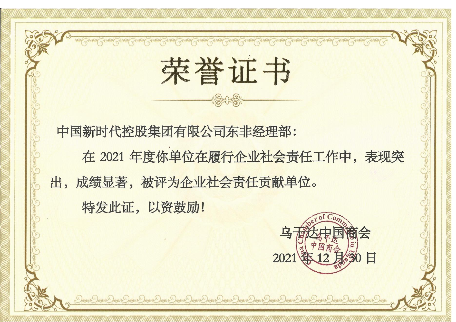 新時(shí)代集團(tuán)東非經(jīng)理部榮獲烏干達(dá)中國(guó)商會(huì)2021年度“企業(yè)社會(huì)責(zé)任貢獻(xiàn)單位”稱(chēng)號(hào) |