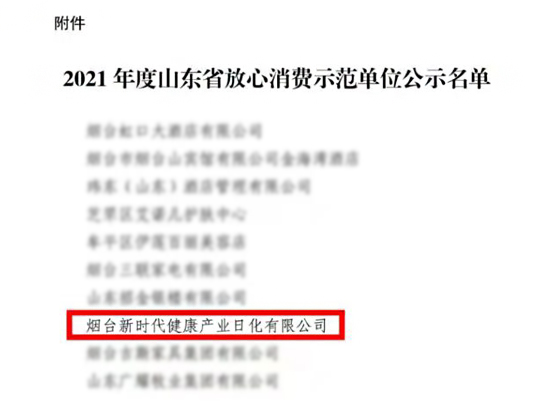 新時(shí)代集團(tuán)下屬煙臺(tái)日化公司獲得“省級(jí)放心消費(fèi)示范單位”榮譽(yù)稱號(hào) |