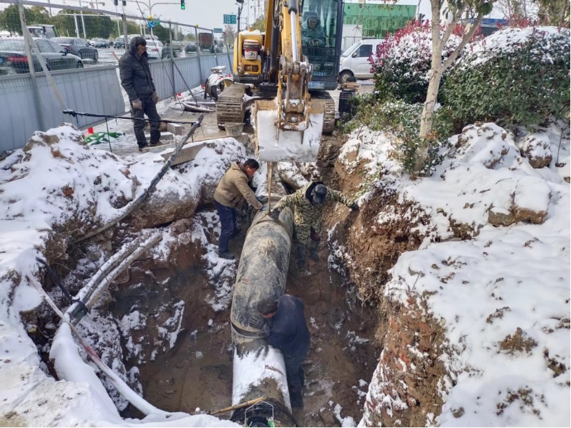 懷遠(yuǎn)這場(chǎng)初雪來得又急又猛,路面覆蓋一層厚厚的積雪,給搶修工作帶來了巨大挑戰(zhàn)。此次搶修現(xiàn)場(chǎng)屬于“流沙”地質(zhì),致使施工條件惡化,為創(chuàng)造施工面帶來了相當(dāng)大的難度。在協(xié)調(diào)辦理破路施工手續(xù)的同時(shí),確定管道溝槽開挖位置,并協(xié)調(diào)機(jī)械、設(shè)備,放置施工圍擋、警示標(biāo)識(shí)等,確保施工安全。面對(duì)施工現(xiàn)場(chǎng)的各種突發(fā)問題,搶修人員“見招拆招”,全力搶修施工。肆無忌憚的大雪和狂風(fēng)咄咄逼人,搶修人員臉凍得發(fā)紫,背著管件,扛著工具的手指被凍得麻木通紅,卻一分鐘都不敢停下手里的工作。 由于備用管網(wǎng)口徑小,為保障春節(jié)期間居民正常用水,搶修人員盡可能縮短施工時(shí)間,堅(jiān)守在施工一線,加班加點(diǎn)爭(zhēng)趕施工進(jìn)度。搶修人員顧不上休息,迎來本次搶修最大困難,即新舊管網(wǎng)碰頭施工工作。由于新舊管網(wǎng)存在錯(cuò)層、高低不等的情況,搶修人員連夜開始焊制加工件。在搶修人員不眠不休、晝夜奮戰(zhàn)的同時(shí),公司客服人員也正在加班加點(diǎn),全力做好群眾解釋宣傳和服務(wù)保障工作。本次搶修最大困難的新舊管網(wǎng)碰頭所有工作均已準(zhǔn)備到位。大家顧不上吃口熱飯,開始進(jìn)行最后的施工任務(wù)。新舊管網(wǎng)連接成功后,經(jīng)管道沖洗、消毒等一系列措施,確保了1月17日前正常通水。 這個(gè)冬天,雖然天寒,但有一種名為“自來水”的溫暖在流淌;盡管地凍,卻有一股稱作“供水人”的溫情在傳遞。懷遠(yuǎn)中環(huán)始終把為用戶排憂解難放到第一位,保供水、保民生,中環(huán)水務(wù)“供水人”一直在路上。