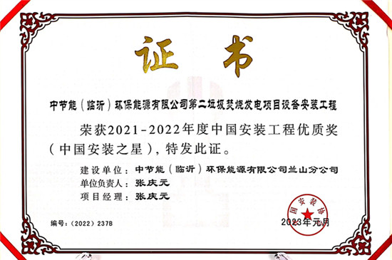 該項目是臨沂市2019年度中心城區(qū)基礎(chǔ)設(shè)施及重點民生項目之一,處理規(guī)模為1500噸/天,于2020年2月21日正式開工,2020年12月23日完成#1機組首次并網(wǎng)發(fā)電,2021年4月30日順利通過72+24小時試運行。 項目建設(shè)過程中,項目部始終秉承“安全可靠、工藝精細(xì)、科學(xué)創(chuàng)新”原則,以“創(chuàng)建中國電力優(yōu)質(zhì)工程,爭創(chuàng)中國安裝之星”為目標(biāo),超前策劃、科學(xué)推進,實施全過程控制,高標(biāo)準(zhǔn)、嚴(yán)要求落實質(zhì)量工藝,按期完成項目72+24小時試運行目標(biāo),實現(xiàn)工程一次性達標(biāo)成優(yōu)。 中國安裝工程優(yōu)質(zhì)獎(中國安裝之星)是我國安裝行業(yè)工程質(zhì)量最高獎,作為我國機電工程建設(shè)領(lǐng)域的最高榮譽之一,被業(yè)內(nèi)人士形象地稱為“安裝工程的魯班獎”。