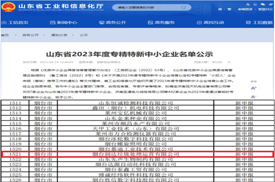 近日,山東省工業(yè)和信息化廳關(guān)于山東省2023年度專精特新中小企業(yè)名單公示,中國環(huán)保潤達運營公司榜上有名,獲得山東省“專精特新”中小企業(yè)稱號。