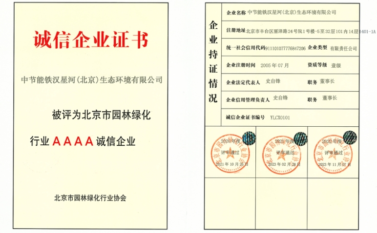 近日,經(jīng)北京市園林綠化行業(yè)協(xié)會(huì)評定,中節(jié)能鐵漢所屬鐵漢星河取得4A等級“誠信企業(yè)”認(rèn)證。自2014年以來,鐵漢星河連續(xù)九年獲此殊榮,以實(shí)力贏得行業(yè)和社會(huì)的持續(xù)認(rèn)可。