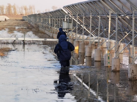 項(xiàng)目并網(wǎng)以后往往得花更多的時(shí)間去維護(hù)發(fā)電設(shè)施,這就要求運(yùn)維人員將已經(jīng)損壞的設(shè)備替換下來,以保證整個(gè)系統(tǒng)的正常運(yùn)行。自8月份以來,突如其來的三場臺風(fēng)給設(shè)備安全穩(wěn)定運(yùn)行帶來嚴(yán)峻考驗(yàn)。進(jìn)入電站的必經(jīng)之路已被大水淹沒,根本看不到路在哪里,所見之處,都是積水,多處道路已變成深水區(qū),運(yùn)維人員沒有退縮,“沒有路也要?jiǎng)?chuàng)造路,就算蹚也得把設(shè)備送進(jìn)去”。于是,運(yùn)維人員便經(jīng)過深水區(qū)運(yùn)送設(shè)備,濕透半截的褲管是不懼臺風(fēng)影響最好的證明。地面積水嚴(yán)重,而光伏組件高度大多超過3米,被水浸泡過的地面無法固定絕緣梯,這給運(yùn)維人員維護(hù)發(fā)電設(shè)備制造了嚴(yán)重障礙,檢修設(shè)備難度大大增加,但這依然阻擋不了運(yùn)維人員進(jìn)行設(shè)備運(yùn)維的決心。面對地面無法固定梯子的困境,運(yùn)維人員紛紛化身“智多星”,群策群力,出謀劃策,最后決定在絕緣梯頂端加裝掛鉤,再用頂端的掛鉤懸掛在光伏支架上進(jìn)行維護(hù),解決運(yùn)維難題。 氣溫驟降,寒風(fēng)颯颯;不懼嚴(yán)寒,站好每一班崗。 由于太陽能華北區(qū)吉林片區(qū)地理位置特殊,常年伴有天氣轉(zhuǎn)涼的跡象,在寒冷的天氣下工作已經(jīng)是運(yùn)維人員的工作常態(tài),但是在零下30-40度的嚴(yán)寒氣溫下進(jìn)行設(shè)備巡檢工作,還是給運(yùn)維人員帶來了極大的挑戰(zhàn)。在巡檢現(xiàn)場,經(jīng)??梢钥吹椒鲈谠O(shè)備上面的手凍得通紅,已經(jīng)變得僵硬。嚴(yán)重的時(shí)候甚至很難進(jìn)行正常的維護(hù)工作,回暖也需要好一陣子??墒菚r(shí)間就是發(fā)電量,設(shè)備提前一分鐘維護(hù)好,我們就多發(fā)一度電。光伏廠區(qū)嚴(yán)禁煙火,于是運(yùn)維人員只能用體溫取暖的方式,將自己的手揣在衣服里貼著皮膚來進(jìn)行緩解,只有這樣才能既保證安全,又能將設(shè)備檢修故障盡快完成。 并網(wǎng)在即,關(guān)卡重重;盡心盡力,發(fā)揮最大的價(jià)值。