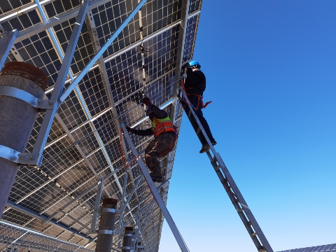 太陽(yáng)能華北區(qū)通榆電站自入秋以來(lái),突如其來(lái)的三場(chǎng)臺(tái)風(fēng)給設(shè)備安全穩(wěn)定運(yùn)行帶來(lái)嚴(yán)峻考驗(yàn)。廠區(qū)積水嚴(yán)重,多處道路變成深水區(qū),給設(shè)備安全穩(wěn)定運(yùn)行帶來(lái)極大隱患,且地面積水無(wú)法架設(shè)絕緣梯,給運(yùn)維人員檢修發(fā)電設(shè)備制造了嚴(yán)重障礙,檢修設(shè)備難度大大增加,但電站運(yùn)維人員不等不靠,紛紛化身“智多星”,群策群力,出謀劃策,最后決定在絕緣梯頂端加裝掛鉤,再用頂端的掛鉤懸掛在光伏支架上進(jìn)行維護(hù),解決運(yùn)維難題。 埋頭苦干戰(zhàn)嚴(yán)寒,提質(zhì)增效保發(fā)電