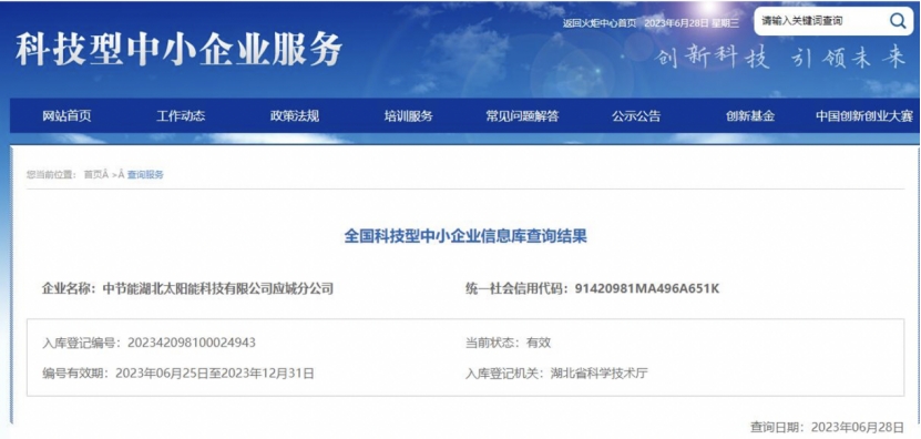 近日,湖北省科學技術廳公布湖北省2023年第七批入庫科技型中小企業(yè)名單,太陽能華中區(qū)下屬應城分公司成功入庫國家科技型中小企業(yè)。