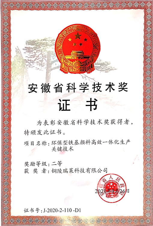 近日,安徽省科技廳發(fā)布了2020年安徽省科學(xué)技術(shù)進(jìn)步獎(jiǎng)獲獎(jiǎng)名單,重慶公司所屬的銅陵瑞萊科技有限公司報(bào)送的《環(huán)保型鐵基顏料高效一體化生產(chǎn)關(guān)鍵技術(shù)》項(xiàng)目榮獲2020年安徽省科技進(jìn)步二等獎(jiǎng)。