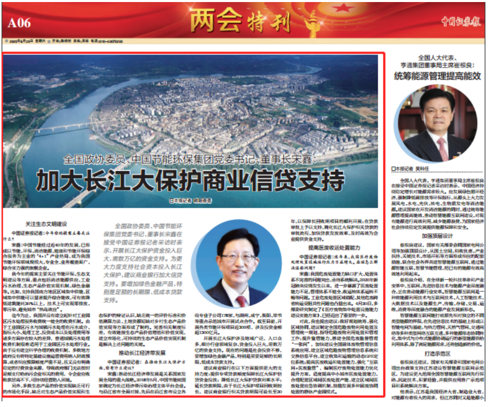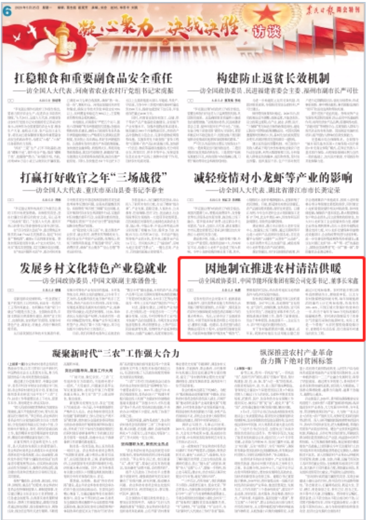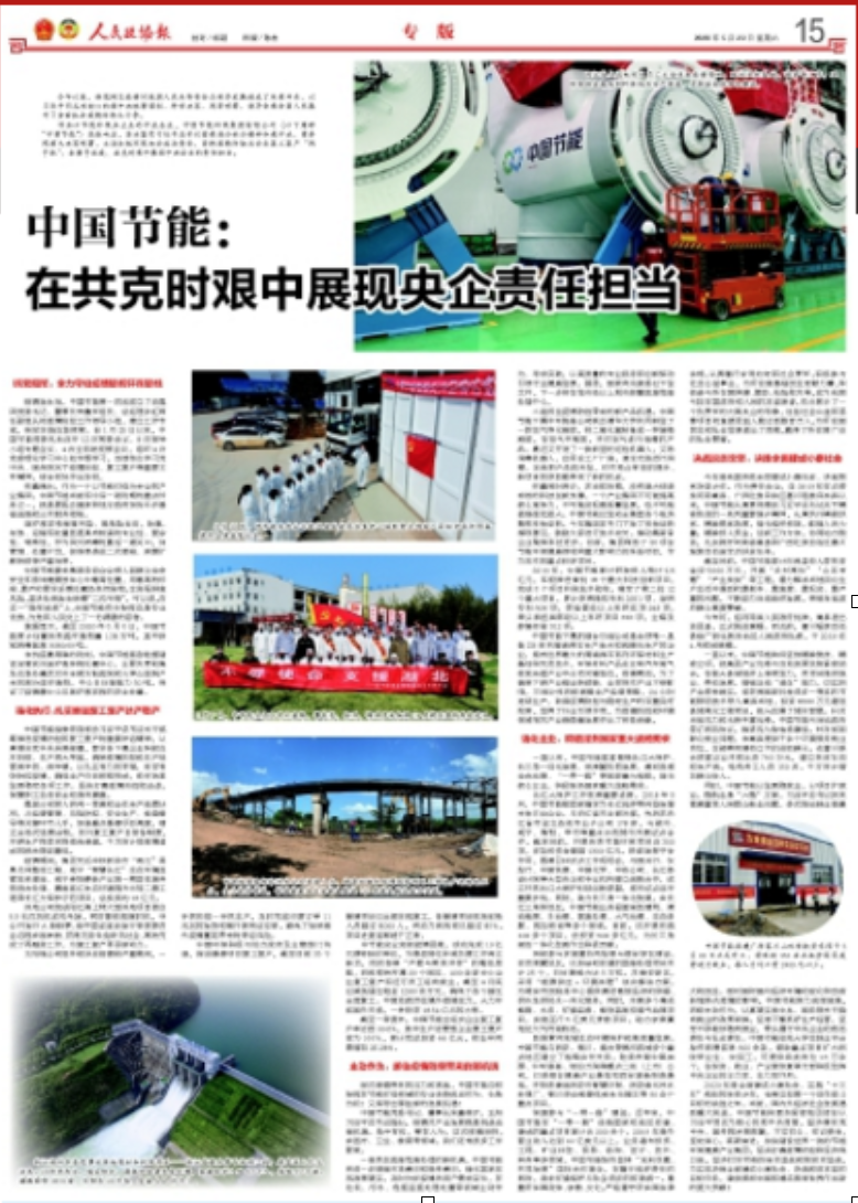 中國(guó)節(jié)能駐富川瑤族自治縣第一書(shū)記 杜進(jìn)波扶貧日記 【媒體聚焦】 集團(tuán)公司兩會(huì)宣傳工作啟動(dòng)以來(lái),宋鑫委員的提案內(nèi)容、“委員通道”受訪內(nèi)容和中國(guó)節(jié)能的重點(diǎn)工作引起多家主流媒體的高度關(guān)注。截至5月27日上午10:00,共有90家媒體及平臺(tái),發(fā)布了122篇新聞報(bào)道。其中,中央電視臺(tái)(CCTV-1、CCTV-13)、人民網(wǎng)、新華網(wǎng)等各大主流媒體對(duì)宋鑫董事長(zhǎng)參加的第二場(chǎng)“委員通道”采訪活動(dòng)進(jìn)行全程直播和全網(wǎng)推送,中央電視臺(tái)《新聞聯(lián)播》5月24日進(jìn)行了專門(mén)報(bào)道?!吨袊?guó)政協(xié)報(bào)》整版刊發(fā)《中國(guó)節(jié)能:在共克時(shí)艱中展現(xiàn)央企責(zé)任擔(dān)當(dāng)》,國(guó)務(wù)院新聞辦公室網(wǎng)站、新華社、人民網(wǎng)、人民政協(xié)網(wǎng)、《科技日?qǐng)?bào)》《中國(guó)報(bào)道》《中國(guó)證券報(bào)》《中國(guó)能源報(bào)》等中央主流媒體刊發(fā)了對(duì)宋鑫委員的專題、專版專訪99篇,《人民日?qǐng)?bào)》《光明日?qǐng)?bào)》等媒體特刊、專欄及時(shí)報(bào)道了對(duì)宋鑫委員的采訪,央視網(wǎng)、新華網(wǎng)快看、中國(guó)證券報(bào)抖音等媒體以專題短片的形式刊發(fā)報(bào)道,外文局所屬全媒體同步刊發(fā)報(bào)道。 本期《中國(guó)節(jié)能報(bào)》(手機(jī)報(bào))在兩會(huì)媒體聚焦第一輯、兩會(huì)媒體聚焦第二輯的基礎(chǔ)上,重點(diǎn)摘錄5月23日-27日中央、地方主流媒體新增的相關(guān)報(bào)道(不包括此前已經(jīng)匯編的“委員通道”報(bào)道),現(xiàn)將新增重點(diǎn)報(bào)道摘編分享如下。 新增媒體報(bào)道鏈接合集見(jiàn)文章末尾 人民政協(xié)報(bào) 中國(guó)節(jié)能:在共克時(shí)艱中展現(xiàn)央企責(zé)任擔(dān)當(dāng)