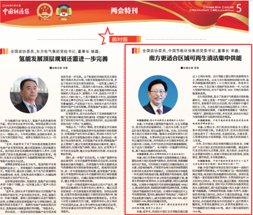 全國(guó)政協(xié)委員,中國(guó)節(jié)能環(huán)保集團(tuán)有限公司黨委書(shū)記、董事長(zhǎng)宋鑫在接受《中國(guó)能源報(bào)》記者采訪時(shí)表示,南方冬季集中供暖不宜簡(jiǎn)單照搬北方做法,要結(jié)合南方地區(qū)的地理氣候特點(diǎn)、自然環(huán)境、資源稟賦條件設(shè)計(jì)考慮,可利用南方豐富的江河湖泊地表水、污水源、淺層地?zé)崮艿?,開(kāi)展更符合南方城市供暖需要的區(qū)域可再生清潔集中供能模式。區(qū)域清潔集中供能是一種先進(jìn)的市政基礎(chǔ)設(shè)施,能顯著提升綜合能效,是現(xiàn)代城市建設(shè)中具有標(biāo)桿意義的綠色低碳能源方案,兼具冬季供暖和夏季供冷,社會(huì)效益明顯,項(xiàng)目公益行屬性強(qiáng)。 中國(guó)能源報(bào) 兩會(huì)訪談丨宋鑫:清潔取暖不能簡(jiǎn)單理解為“煤改氣”“煤改電” 全國(guó)兩會(huì)期間,全國(guó)政協(xié)委員,中國(guó)節(jié)能環(huán)保集團(tuán)有限公司黨委書(shū)記、董事長(zhǎng)宋鑫對(duì)《中國(guó)能源報(bào)》記者表示,解決農(nóng)村地區(qū)老百姓的清潔供暖問(wèn)題,需要國(guó)家、地方政府、企業(yè)和全社會(huì)的共同努力,根據(jù)不同地區(qū)的實(shí)際情況,因地制宜,循序漸進(jìn),務(wù)實(shí)地加以推進(jìn)解決。 宋鑫表示,各省在推行清潔供暖這項(xiàng)民生工程中,應(yīng)堅(jiān)持因地制宜原則,不能簡(jiǎn)單地理解為“煤改電”“煤改氣”,要根據(jù)農(nóng)村實(shí)際,多元發(fā)展,結(jié)合農(nóng)村地區(qū)當(dāng)?shù)刭Y源條件與經(jīng)濟(jì)狀況穩(wěn)步推進(jìn)。 中國(guó)證券報(bào) 全國(guó)政協(xié)委員,中國(guó)節(jié)能環(huán)保集團(tuán)黨委書(shū)記、董事長(zhǎng)宋鑫:加大長(zhǎng)江大保護(hù)商業(yè)信貸支持