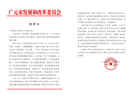 近日,風(fēng)電西中區(qū)域公司所屬中節(jié)能風(fēng)力發(fā)電四川有限公司收到來自四川省廣元市發(fā)展和改革委員會的感謝信。