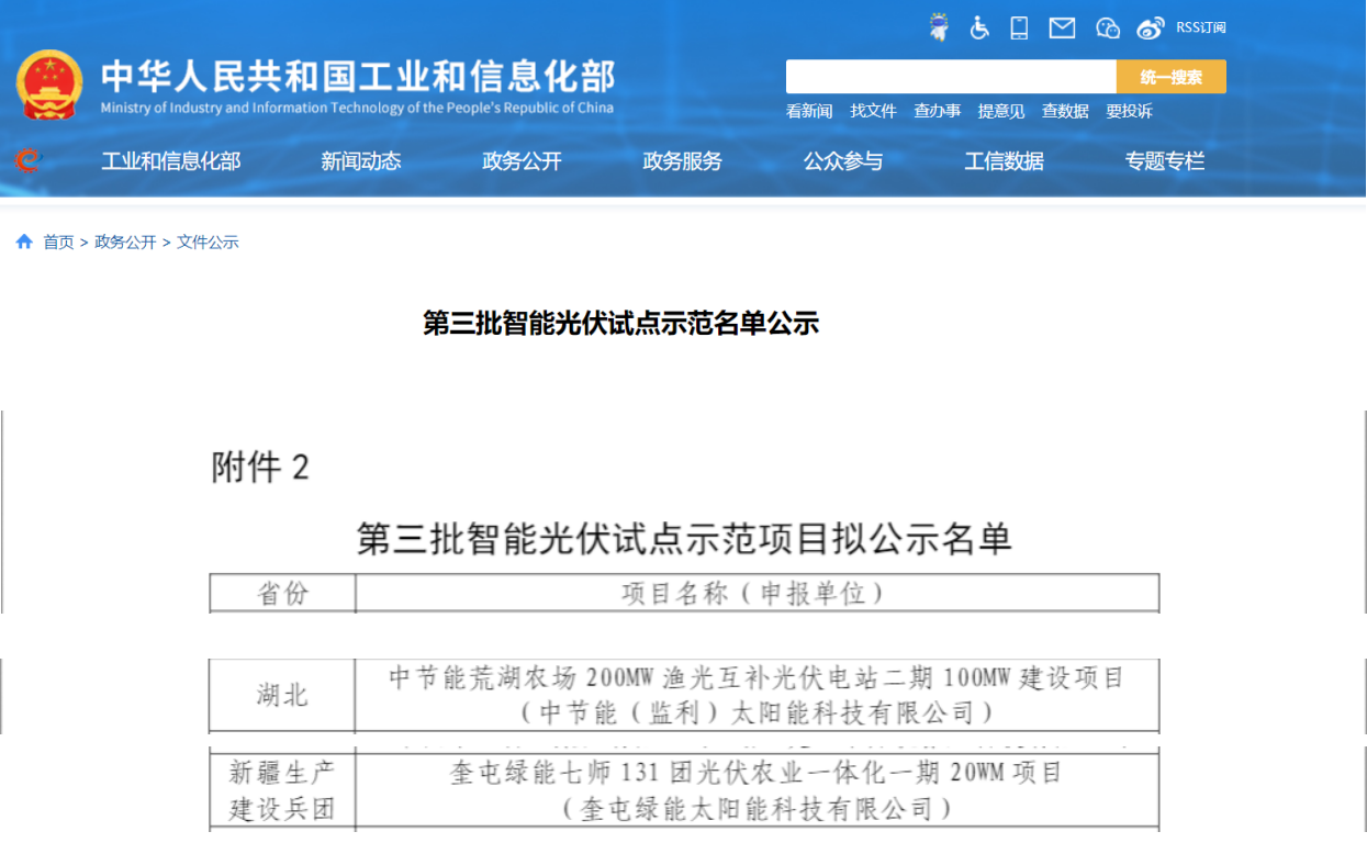 近日,國家工信部發(fā)布了第三批智能光伏項目試點示范名單,太陽能公司新疆區(qū)的奎屯綠能七師131團光伏農業(yè)一體化一期20MW項目(以下簡稱奎屯項目)”和“華中區(qū)的中節(jié)能荒湖農場200MW漁光互補光伏電站二期100MW建設項目以下簡稱監(jiān)利項目2個項目成功入選。