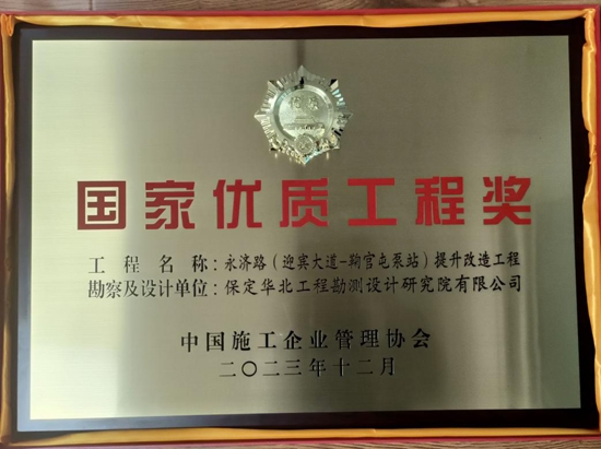 近日,中國(guó)施工企業(yè)管理協(xié)會(huì)公布的2022-2023年度國(guó)家優(yōu)質(zhì)工程獎(jiǎng)評(píng)選結(jié)果中,中國(guó)地質(zhì)工程集團(tuán)有限公司河北分公司(原保定華北工程勘測(cè)設(shè)計(jì)研究院)參建的永濟(jì)路(迎賓大道-鞠官屯泵站)提升改造工程項(xiàng)目榮獲“國(guó)家優(yōu)質(zhì)工程獎(jiǎng)”。