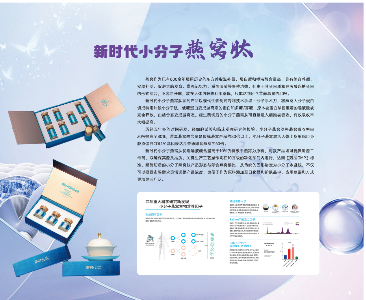 論壇以“大健康食品”為主題,以“科學創(chuàng)新、技術落地”為宗旨,來自行業(yè)的科學家、高校教授以及行業(yè)領先企業(yè)管理者等共聚一堂,探討健康食品行業(yè)新趨勢,展示最新研究成果,推動產(chǎn)學研合作,助推科研成果的落地轉(zhuǎn)化。 新時代集團作為大會合作單位,作了“燕窩口服抗衰新產(chǎn)品開發(fā)及臨床應用”報告,按“科技燕窩”的理念,采用定向生物酶切技術將高分子量的燕窩糖蛋白剪切為小分子糖肽,將燕窩具有的促進神經(jīng)發(fā)育、潤肺、美白等生物活性徹底釋放,解決了燕窩糖蛋白難以吸收的問題。