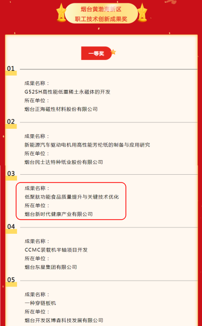 4月26日上午,煙臺黃渤海新區(qū)召開“五一”國際勞動節(jié)暨先進表彰大會,會上對2022年度職工創(chuàng)新成果申報項目及先進個人進行了表彰。新時代集團下屬煙臺新時代健康產(chǎn)業(yè)有限公司(簡稱煙臺健康公司)職工創(chuàng)新成果“低聚肽功能食品質量提升與關鍵技術優(yōu)化”項目,獲得黃渤海新區(qū)職工創(chuàng)新成果一等獎。
