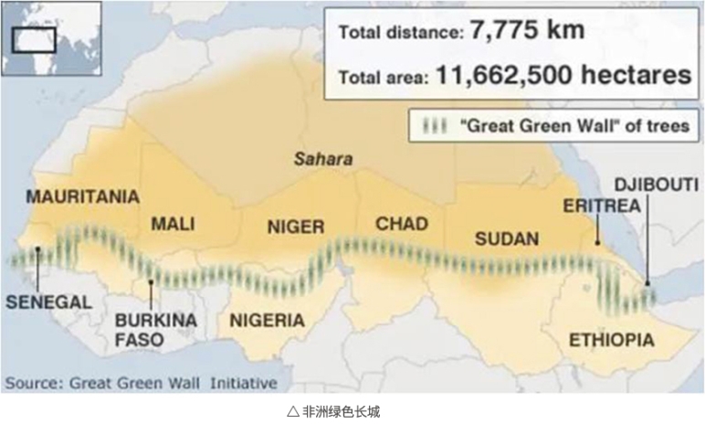 “非洲綠色長城”是2007年經(jīng)非洲聯(lián)盟決議的一項泛非植被屏障倡議,涵蓋了撒哈拉沙漠北部和南部所有的干旱與半干旱區(qū),核心區(qū)域面積為7.8億公頃,涉及2.32億人口,現(xiàn)已成為非洲經(jīng)濟(jì)社會的“綠色屏障”,被稱之為“非洲準(zhǔn)備面對未來的象征”。