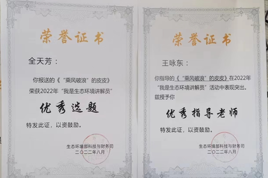 中國環(huán)保即墨公司參加生態(tài)環(huán)境部舉辦2022年“我是生態(tài)環(huán)境講解員”活動(dòng),全天芳的原創(chuàng)生態(tài)環(huán)境選題《“乘風(fēng)破浪”的皮皮》榮獲“優(yōu)秀選題”獎(jiǎng)項(xiàng)。