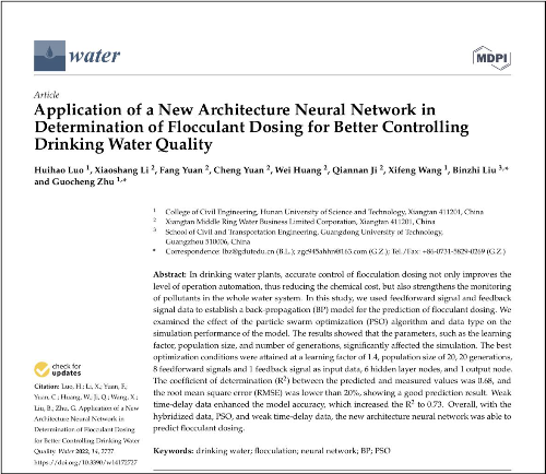 近日,中環(huán)水務(wù)下屬湘潭中環(huán)水務(wù)有限公司“自來水廠凈水系統(tǒng)中絮凝神經(jīng)網(wǎng)絡(luò)的構(gòu)建”項(xiàng)目研發(fā)團(tuán)隊(duì)的研究成果——題為《Application of a New Architecture Neural Network inDetermination of Flocculant Dosing for Better ControllingDrinking Water Quality》的學(xué)術(shù)論文在瑞士《Water》(影響因子3.530)期刊上正式發(fā)表。該研究團(tuán)隊(duì)的另一篇題為“Developing flocculation tensor to monitor water quality using deep learning model”的學(xué)術(shù)研究成果也即將在德國《Environmental Chemistry Letters》(環(huán)境化學(xué)快報(bào))(影響因子13.615)上刊登。這兩篇論文都將錄入SCI數(shù)據(jù)庫。