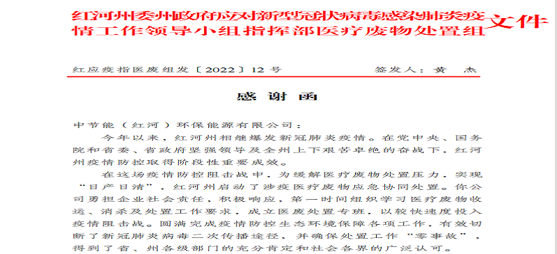 2022年11月29日,紅河州應(yīng)對疫情工作領(lǐng)導(dǎo)小組指揮部醫(yī)療廢物處置組為表感謝,向中國環(huán)保紅河公司發(fā)來感謝函。