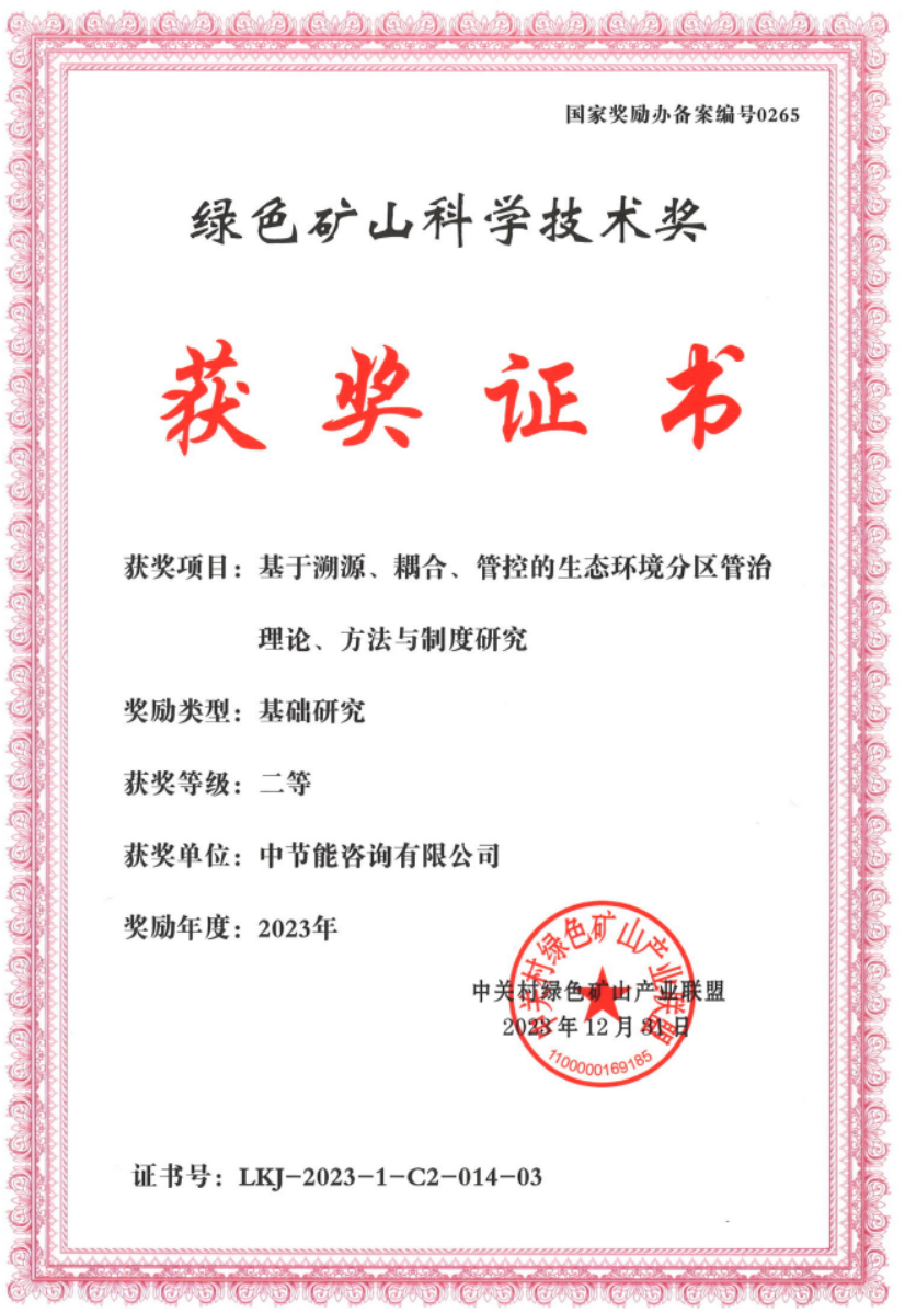 綠色礦山科學(xué)技術(shù)獎(jiǎng)是2015年科技部國(guó)家科學(xué)技術(shù)獎(jiǎng)勵(lì)辦公室批準(zhǔn)中綠盟設(shè)立、國(guó)家獎(jiǎng)勵(lì)辦備案的社會(huì)科技獎(jiǎng)勵(lì),目的是為表彰在綠色礦山創(chuàng)建中做出貢獻(xiàn)的單位和個(gè)人,是該領(lǐng)域具有影響力和代表性的科技獎(jiǎng)勵(lì)。 中節(jié)能咨詢環(huán)境保護(hù)研究組自2014年進(jìn)入生態(tài)環(huán)境分區(qū)研究領(lǐng)域,承擔(dān)并參與了首批城市環(huán)境總體規(guī)劃試點(diǎn)環(huán)境功能區(qū)劃專題研究,國(guó)家發(fā)改委、環(huán)保部、國(guó)土資源部、住建部首批市縣“多規(guī)合一”試點(diǎn)研究,兩辦文件部署的省級(jí)空間規(guī)劃試點(diǎn)5個(gè)縣市工作,生態(tài)環(huán)境部“三線一單”試點(diǎn)工作。承擔(dān)了國(guó)家部委“多規(guī)合一”、主體功能區(qū)制度、“三線一單”、生態(tài)環(huán)境分區(qū)等研究課題10項(xiàng)。 中節(jié)能咨詢?cè)谏鷳B(tài)環(huán)境分區(qū)研究領(lǐng)域十年耕耘,參與出版了《國(guó)土空間生態(tài)環(huán)境分區(qū)管治制度研究》(2023)《國(guó)土空間生態(tài)環(huán)境分區(qū)管治理論與技術(shù)方法研究》(2019)《“多規(guī)合一”試點(diǎn)實(shí)踐和理論創(chuàng)新》(2020)《中國(guó)生態(tài)環(huán)境分區(qū)管治制度的演進(jìn)與發(fā)展》(待出版)4部專著。相關(guān)研究成果榮獲2019年度優(yōu)秀城市規(guī)劃設(shè)計(jì)獎(jiǎng)三等獎(jiǎng),2019年度北京市優(yōu)秀城鄉(xiāng)規(guī)劃獎(jiǎng)二等獎(jiǎng),2018年度環(huán)境保護(hù)科學(xué)技術(shù)獎(jiǎng)二等獎(jiǎng),此次再次獲得2023年度綠色礦山科學(xué)技術(shù)獎(jiǎng)基礎(chǔ)研究類二等獎(jiǎng),既是對(duì)十年研究堅(jiān)持的肯定,又是對(duì)前路的指引。 2023年12月27日,《中共中央 國(guó)務(wù)院關(guān)于全面推進(jìn)美麗中國(guó)建設(shè)的意見》明確提出“完善全域覆蓋的生態(tài)環(huán)境分區(qū)管控體系,為發(fā)展‘明底線’、‘劃邊框’。”下一步,中節(jié)能咨詢將在生態(tài)環(huán)境分區(qū)管控領(lǐng)域持續(xù)發(fā)力,為美麗中國(guó)建設(shè)貢獻(xiàn)力量。