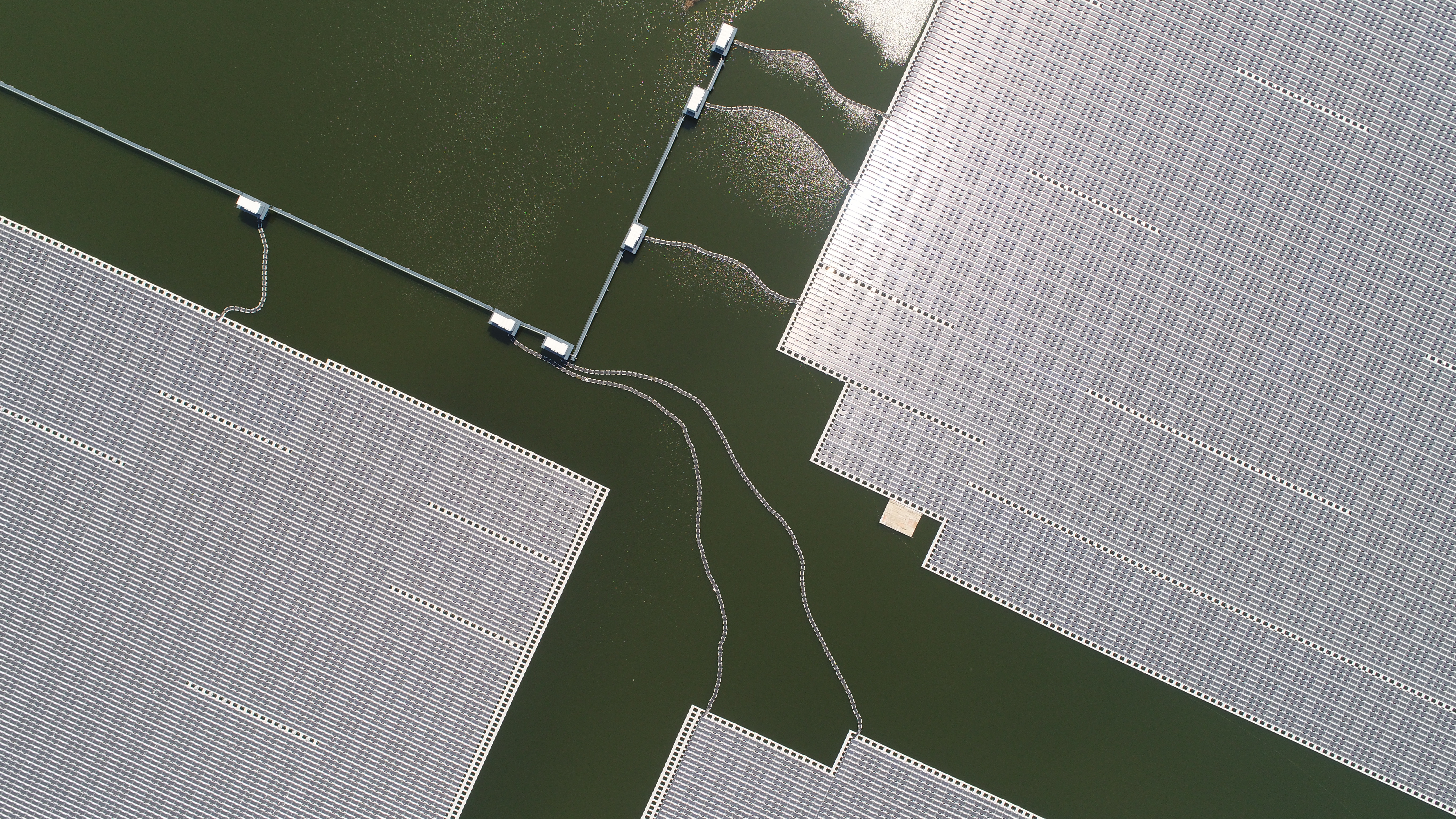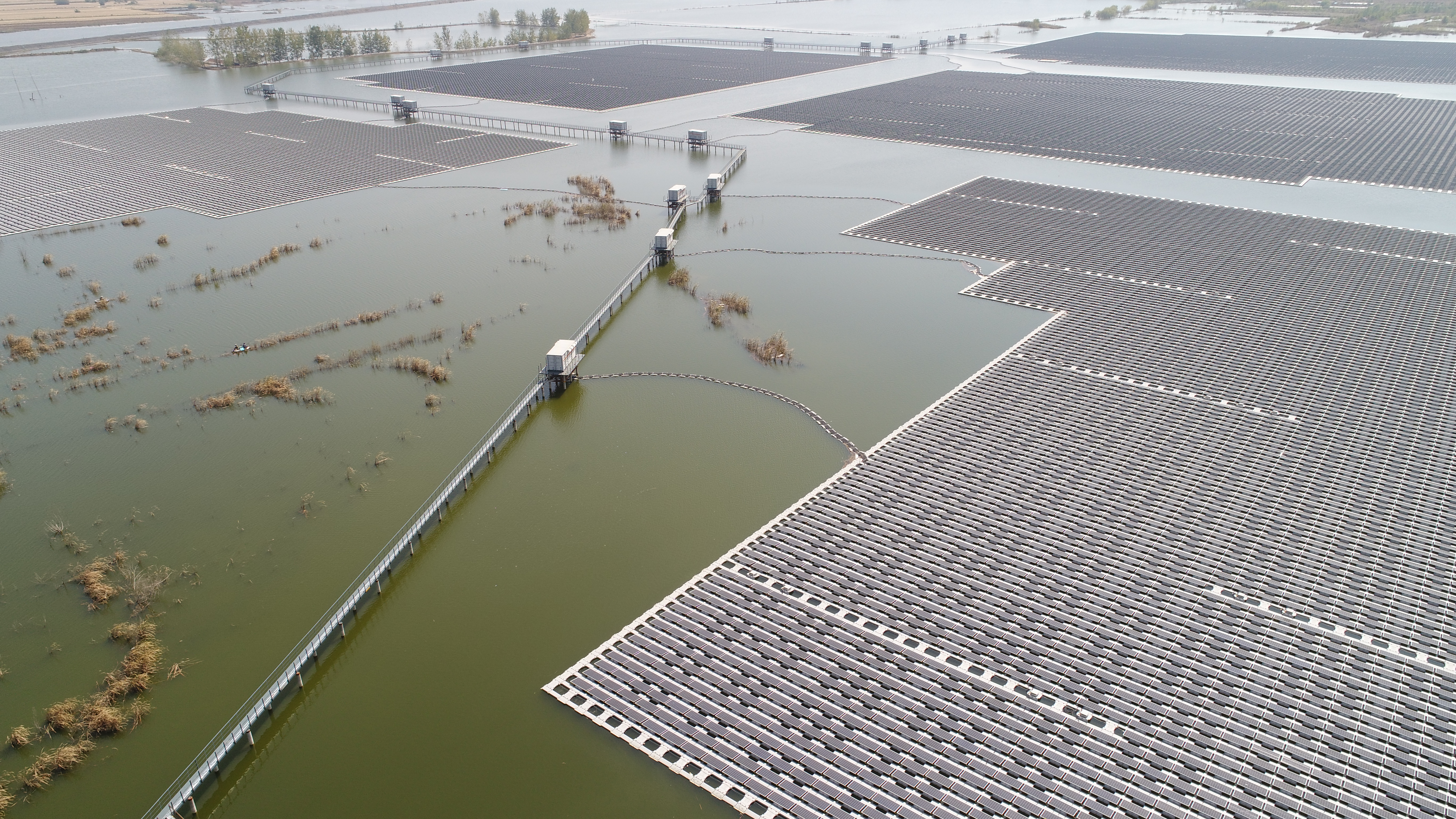 為了做好生態(tài)系統(tǒng)的修復(fù),在國家和有關(guān)部門大力支持下,2017年6月,太陽能公司總投資5億元,綜合利用宿州市埇橋區(qū)朱仙莊鎮(zhèn)2100畝采煤沉陷區(qū)形成的水面,建設(shè)水上漂浮式光伏發(fā)電項目。與傳統(tǒng)陸地電站不同,水面光伏發(fā)電項目真正實現(xiàn)了光伏“水上漂”。項目共使用約194700塊PERC高效單晶光伏組件和520000個浮筒,組配安裝后分布在13個大小不一的浮島上。其中,最大浮島容量為8.536兆瓦。 該項目漂浮系統(tǒng)技術(shù)是依托浮筒組件固定系統(tǒng)具有自適應(yīng)調(diào)整機制,可以釋放浮筒因熱脹冷縮帶來的變形應(yīng)力,為浮島上組件的長久安全護(hù)航。項目投運4年來,經(jīng)歷了多次強風(fēng)極端天氣,始終保持安全運行,2020年發(fā)電量達(dá)8400多萬度,遠(yuǎn)超設(shè)計值。 助力生態(tài)環(huán)保 水上光伏電站美出新高度