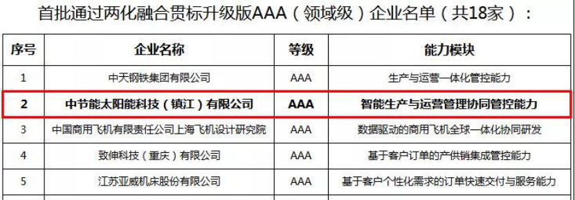 太陽能鎮(zhèn)江公司入圍全國首批兩化融合管理體系升級版貫標達標AAA企業(yè) |