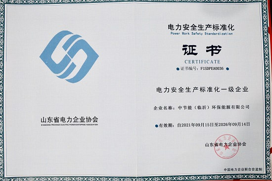中國環(huán)保臨沂公司獲得山東省電力安全生產(chǎn)標(biāo)準(zhǔn)化一級(jí)企業(yè)證書 |