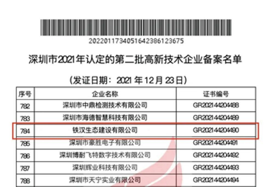 根據《高新技術企業(yè)認定管理辦法》(國科發(fā)火〔2016〕32號)和《高新技術企業(yè)認定管理工作指引》(國科發(fā)火〔2016〕195號)文件規(guī)定,經審核推薦、前置審查、專家評審、公示、申請備案等程序,全國高企認定辦對深圳市2021年第二批認定的鐵漢生態(tài)建設有限公司等企業(yè)予以高新技術企業(yè)備案。