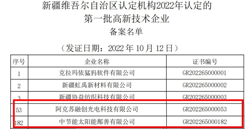 近日,全國高新技術(shù)企業(yè)認定管理工作領(lǐng)導小組辦公室發(fā)布了《新疆維吾爾自治區(qū)認定機構(gòu)2022年認定的第一批303家高新技術(shù)企業(yè)備案名單》,太陽能新疆區(qū)下屬中節(jié)能太陽能鄯善有限公司、阿克蘇融創(chuàng)光電科技有限公司2家公司被認定為2022年第一批國家高新技術(shù)企業(yè)。